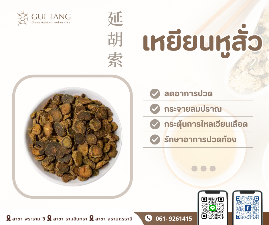 ฤทธิ์ของเหยียนหูสั่ว: รสขม เผ็ด ฤทธิ์อุ่น เข้าสู่เส้นลมปราณหัวใจ ตับและม้าม