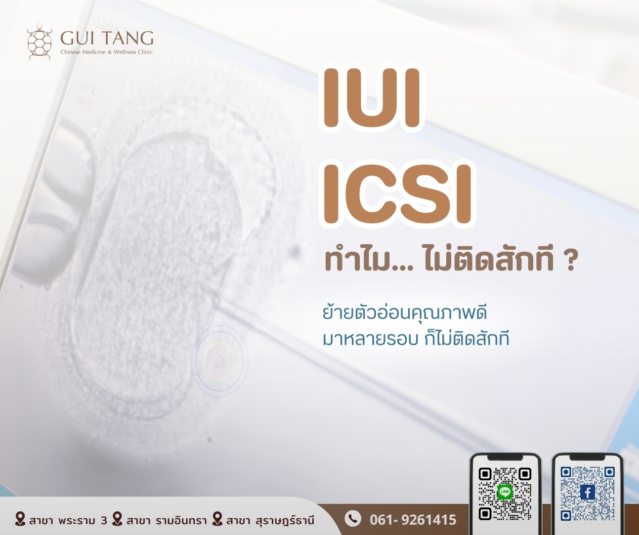 สำหรับแพทย์แผนจีน แล้ว หากพยายามมีบุตรมาหลายวิธีแล้ว เช่นนั้นก็เป็นไปได้ว่า ร่างกายอาจขาดสมดุลหลายส่วนที่ทำให้ตั้งครรภ์ไม่ติด เช่น ร่างกายของคุณผู้หญิงมีเลือดคั่งค้างจนไปอุดกั้นมดลูกและเส้นลมปราณจงและเหรินที่วิ่งไปหล่อเลี้ยงมดลูกถูกอุดกั้น หรือ เลือดน้อย บำรุงเลือดไม่พอ การไหลเวียนเลือดไปเลี้ยงมดลูกน้อย เลือดติดขัด ร่างกายเครียดเกินไป หรือ มดลูกเย็นเกินไป เยื่อบุโพรงมดลูกหนาตัวไม่แข็งแรงพอ จะรองรับไข่ที่ผสมแล้ว เลยทำให้ตัวอ่อนไม่ฝังตัว ไม่ว่าจะทำ ICI … IVF …. หรือ ICSI (อิ๊กซี่) เลยไม่สำเร็จก็เป็นได้