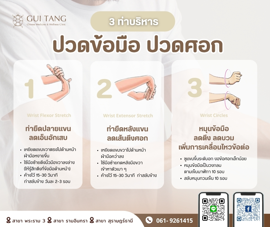 เพื่อป้องกันไม่ให้เรื้อรัง ลองทำ ท่าบริหารข้อมือ – ข้อศอก 3 ขั้นตอน ที่ช่วยผ่อนคลาย เสริมความยืดหยุ่นของข้อมือ และลดอาการปวดศอกดู